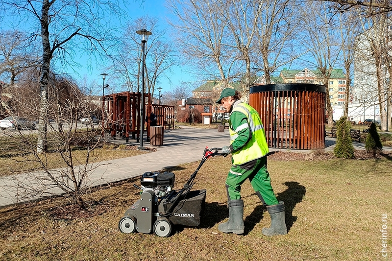 2 апреля сотрудники предприятия «Горзеленстрой» провели работы по вычесыванию старой травы в Бисквитном сквере. Для этого применялся скарификатор — специальное устройство для ухода за газонами и профилактики болезней.